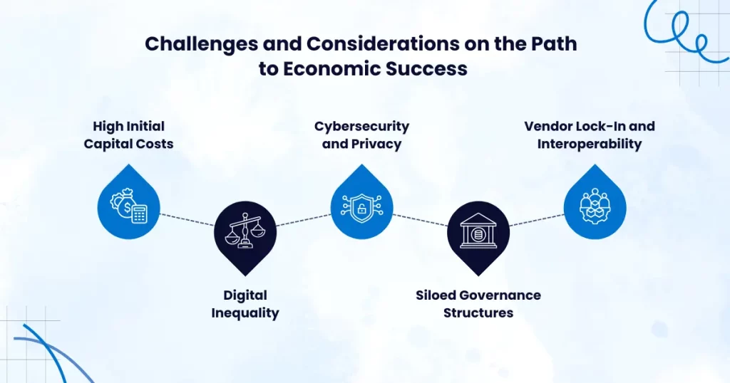 While the Economic outcomes of smart cities are clear, the path to becoming a smart city is complex and not without risks. Cities must navigate several critical challenges: